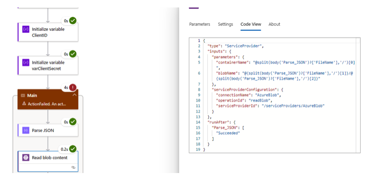 Here is the Read from Blob part in the “processing” Logic App where we split the BlobUrl on ‘/’ to get to the container and filename.
