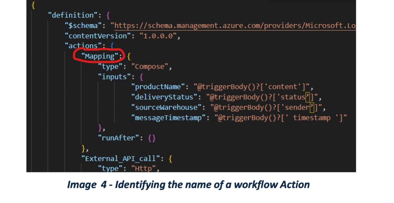 The message will then be mapped by the Compose Action (renamed to Mapping) to return the following example output: