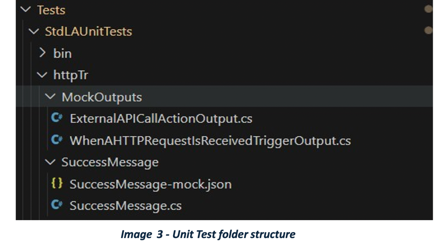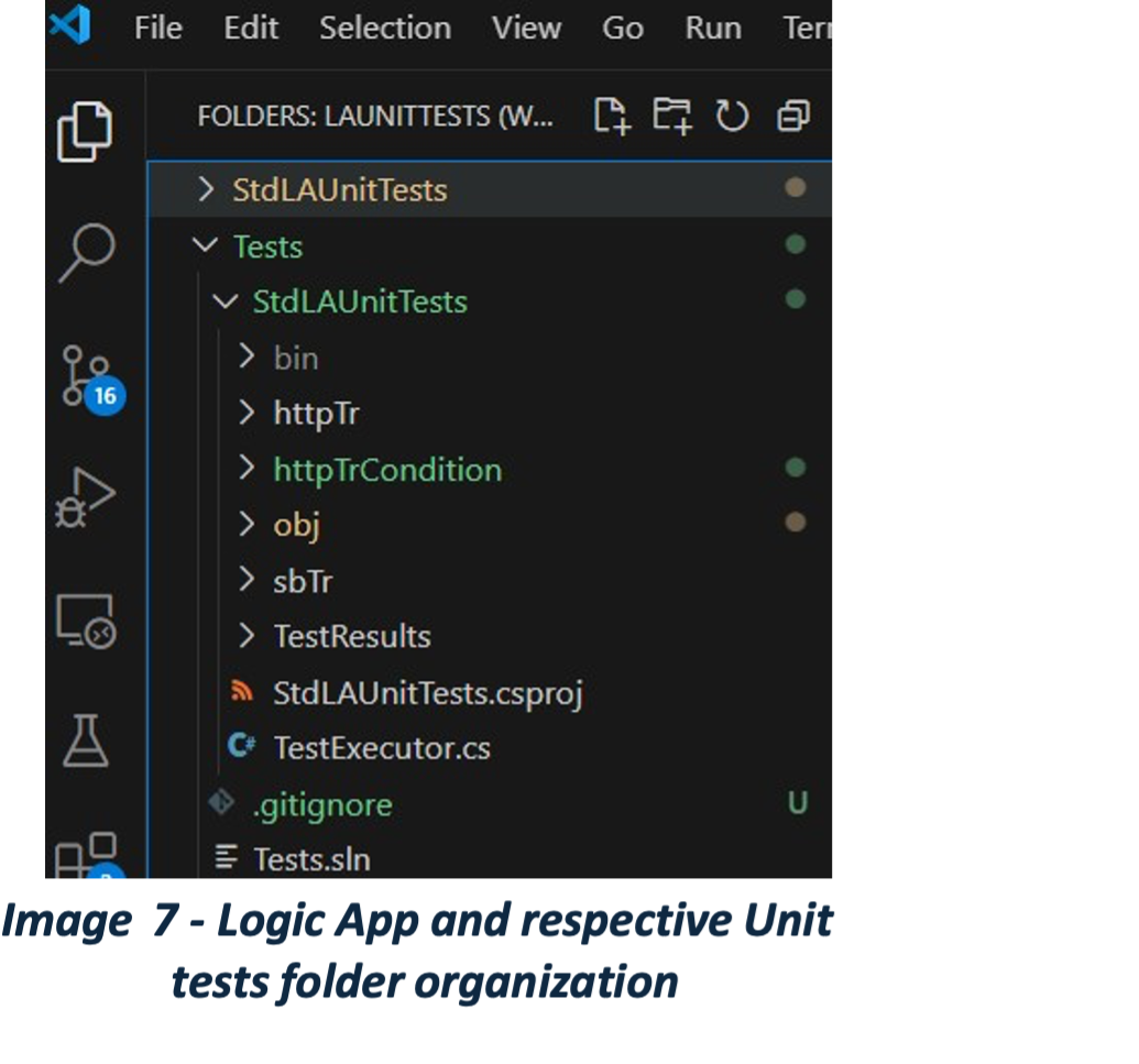 In which StdLAUnitTests refers to the name of the LogicApp, the httpTr folder contains Unit Tests 1 and 2, the sbTr folder contains the Unit Test 3 and the httpTrCondition one includes the Unit Test 4