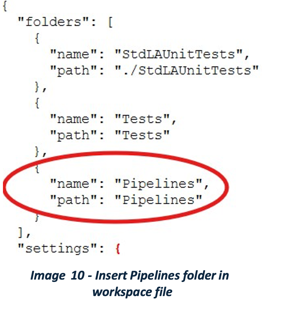 We will start by creating a new directory called Pipelines in the root directory, and including it in the workspace file that should be located in the same directory under the name: