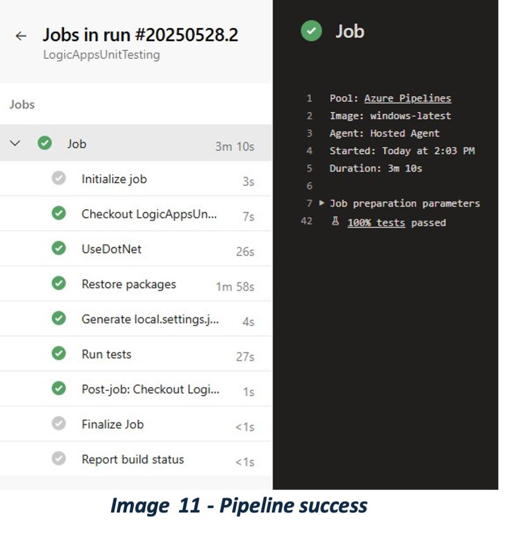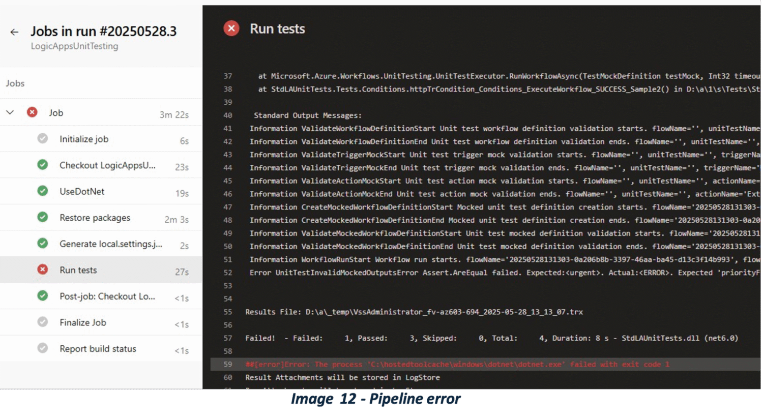 As we can see the pipeline fails, which means that if, for instance, we place this pipeline Job before a Logic App deployment Job, we can prevent it from being deployed in the Azure Portal with errors, thus providing an early diagnosis.