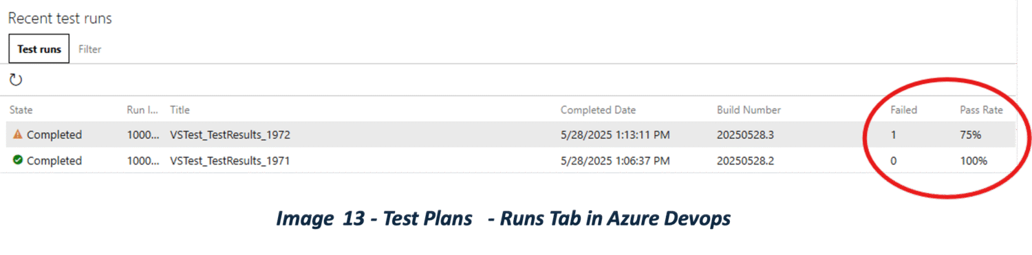 We can also observe that these tests were published in the Test Runs tab, giving us a percentage of successful Unit Tests (pass rate). In this case, 1 of the 4 tests failed in the second run, resulting in a pass rate of 75%, as show in the image below.
