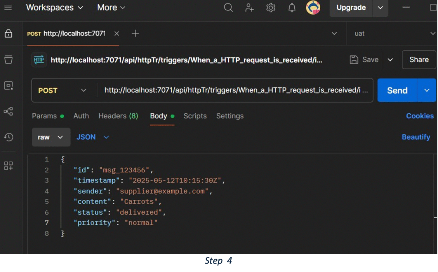 - Mocking the Trigger by injecting a predefined JSON payload to mimic incoming messages.